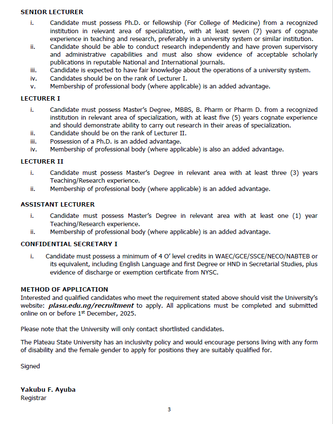 The Plateau State University has an inclusivity policy and would encourage persons living with any form of disability and the female gender to apply for positions they are suitably qualified for.