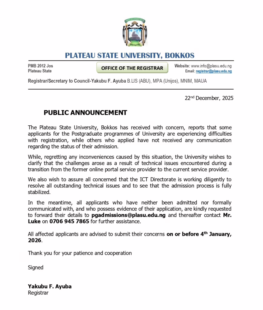The Plateau State University, Bokkos has received with concern, reports that some applicants for the Postgraduate programmes of University are experiencing difficulties with registration, while others who applied have not received any communication regarding the status of their admission. While, regretting any inconveniences caused by this situation, the University wishes to clarify that the challenges arose as a result of technical issues encountered during a transition from the former online portal service provider to the current service provider.